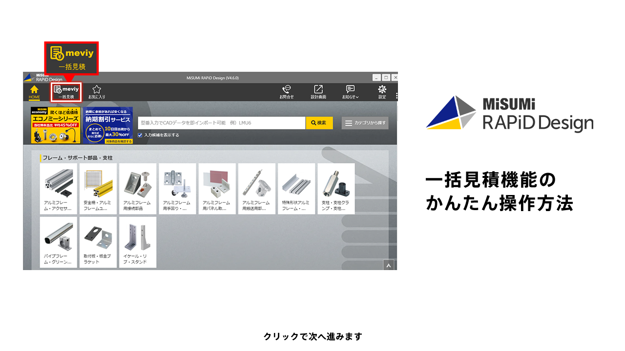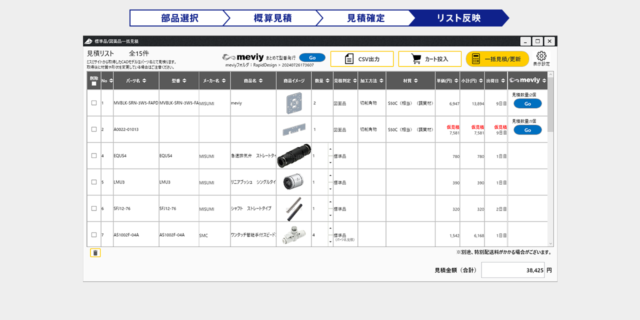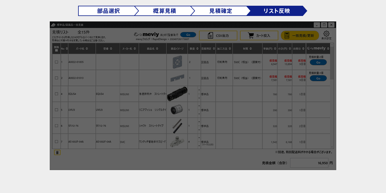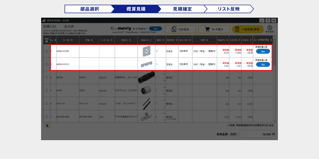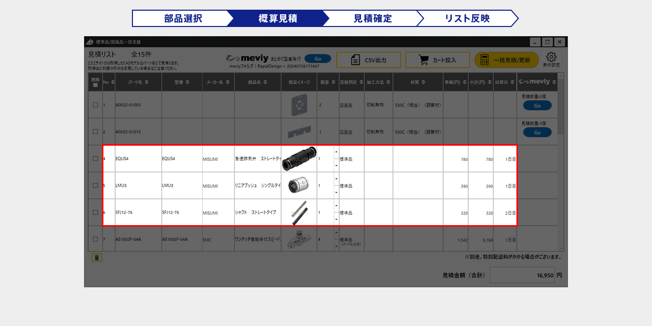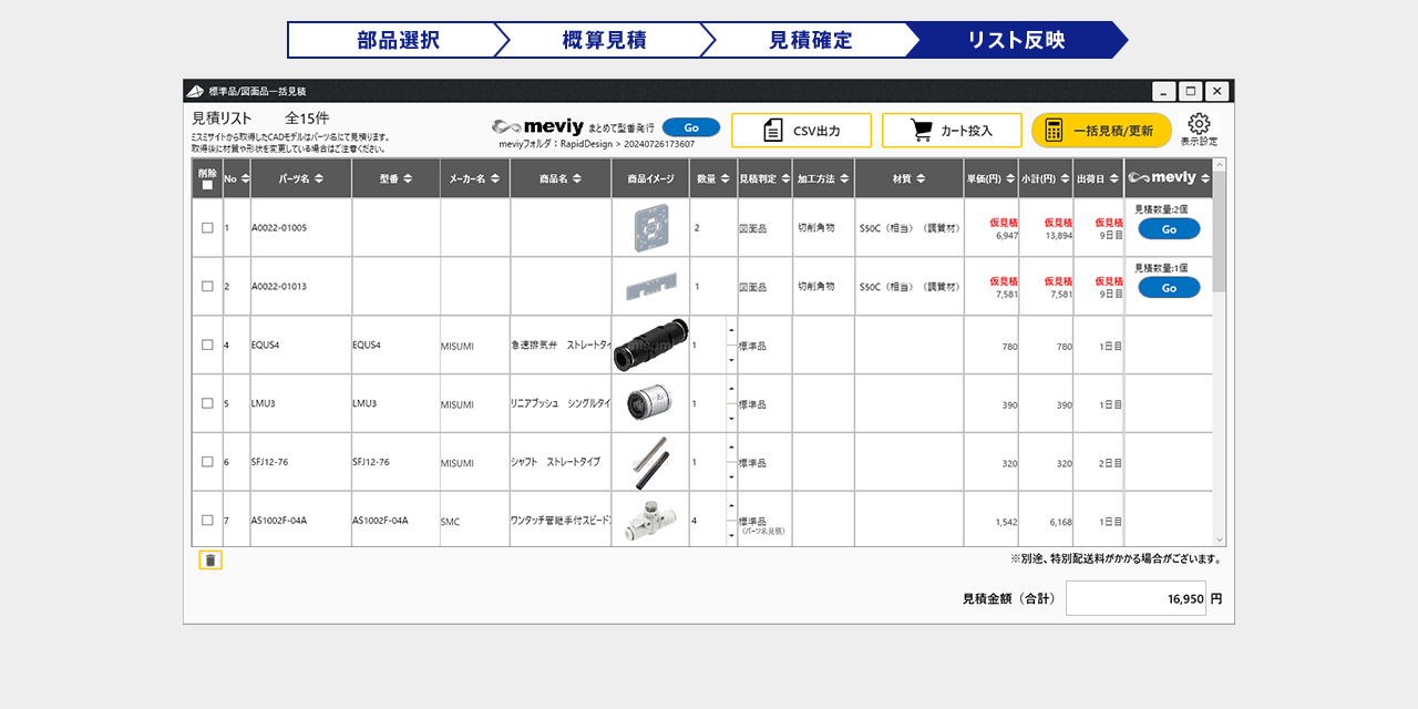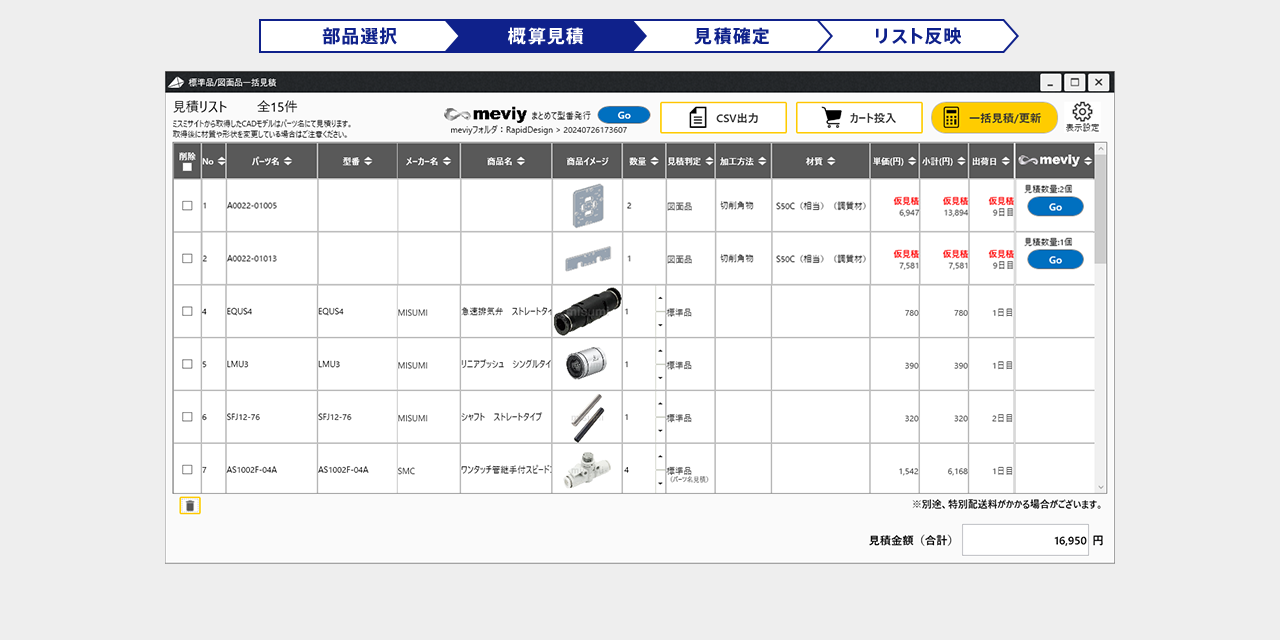 見積リストをCSVファイルで出力と、ミスミサイトの注文画面にカート投入も可能