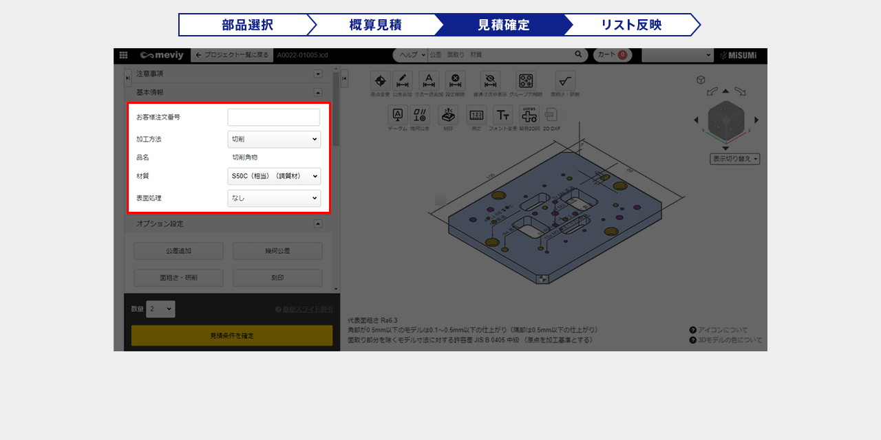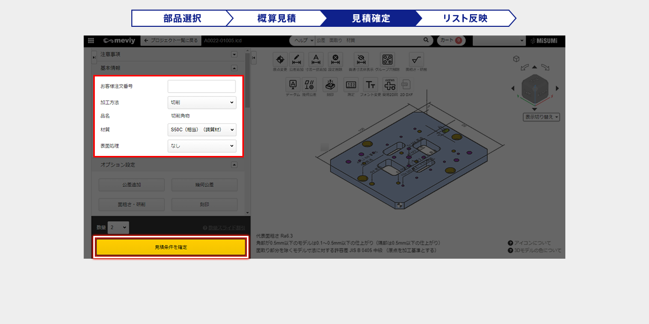 meviyのページへ遷移し、仕様を選択して見積条件を確定ボタンをクリック