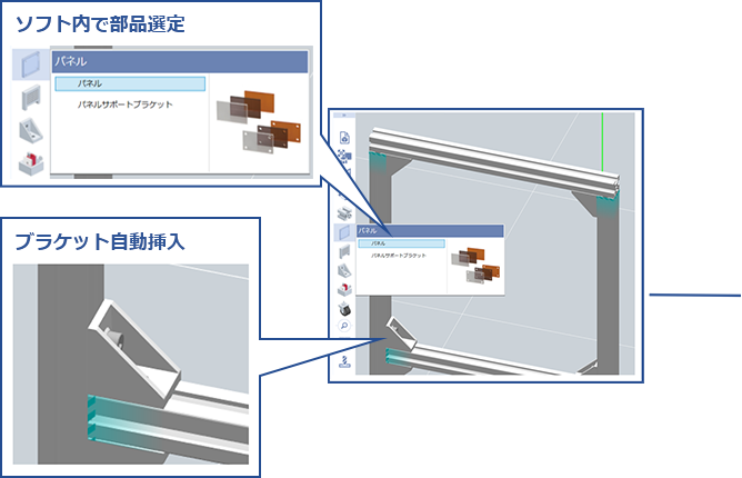 締結が必要な箇所にはブラケットが自動で配置され、干渉している箇所も