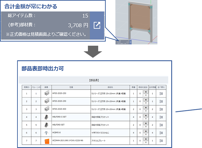 部品を選定して寸法を指定したら、型番は自動生成され、合計金額も表示
